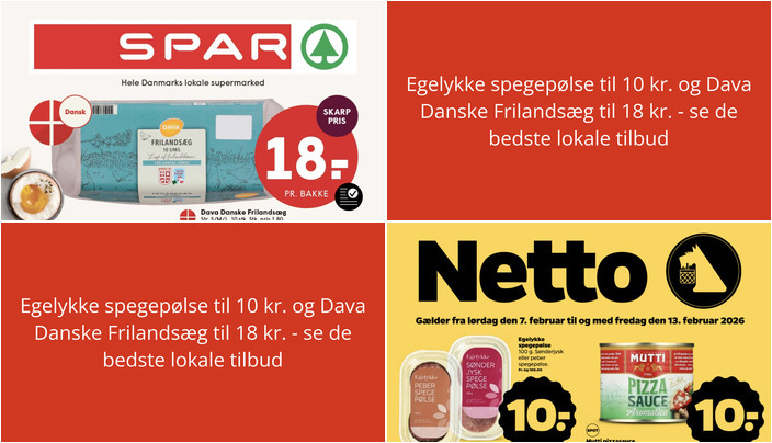 Netto tilbyder Egelykke spegepølse, enten Sønderjysk eller peber variant, til en skarp pris af 10 kr. for 100 g. Dette tilbud gælder fra lørdag den 7. februar til fredag den 13. februar.