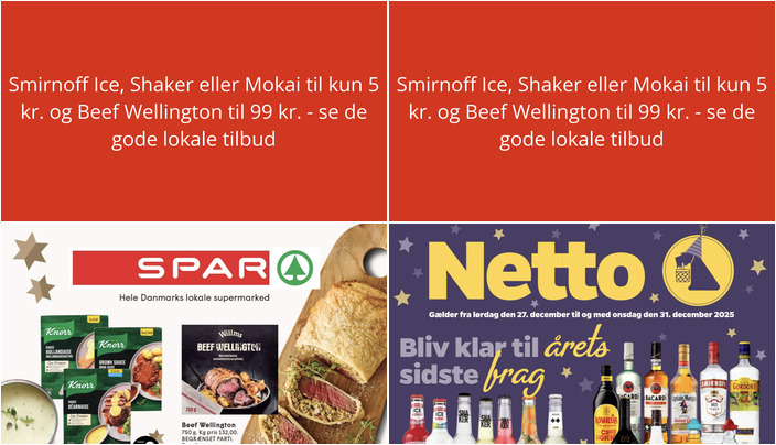 Netto har et skarpt tilbud på Smirnoff Ice, Shaker eller Mokai til kun 5 kr. for 27,5 cl + pant. Du kan købe op til 24 stk. pr. variant pr. kunde pr. dag til denne pris. Tilbuddet gælder fra lørdag den 27. december til onsdag den 31. december.
